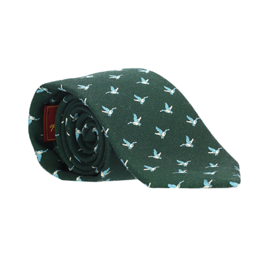 Corbata de lana con fondo verde y adorno de gansos.