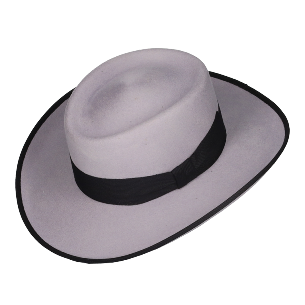 Sombrero tipo gambler en lana gris plata y con la cinta en negra.