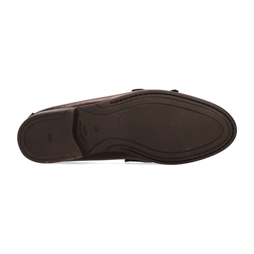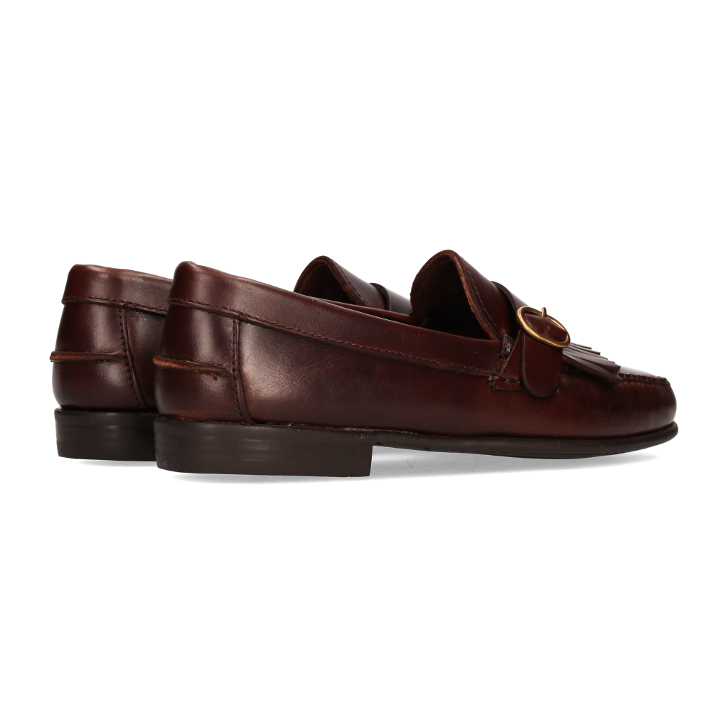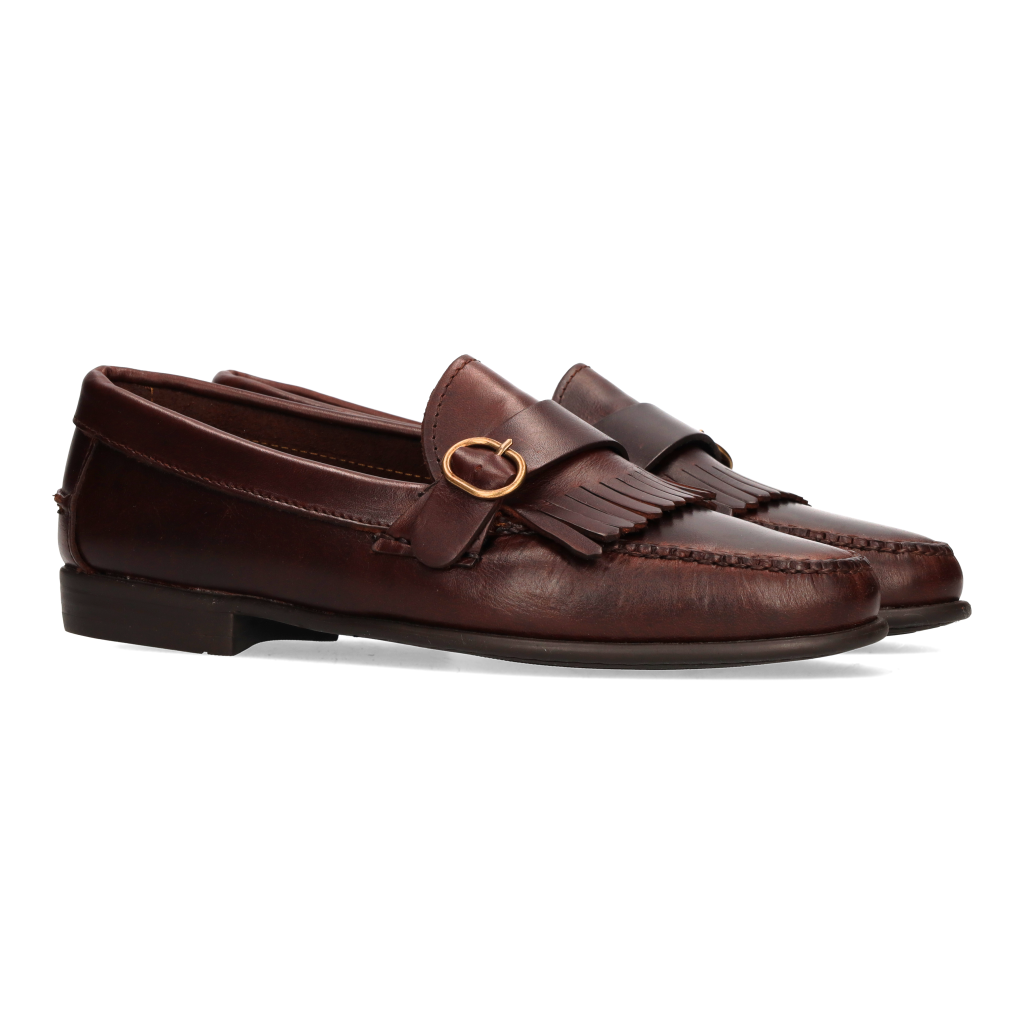 Mocasín de hombre, con adorno de hebilla y flecos, en color moka. Suela de goma.