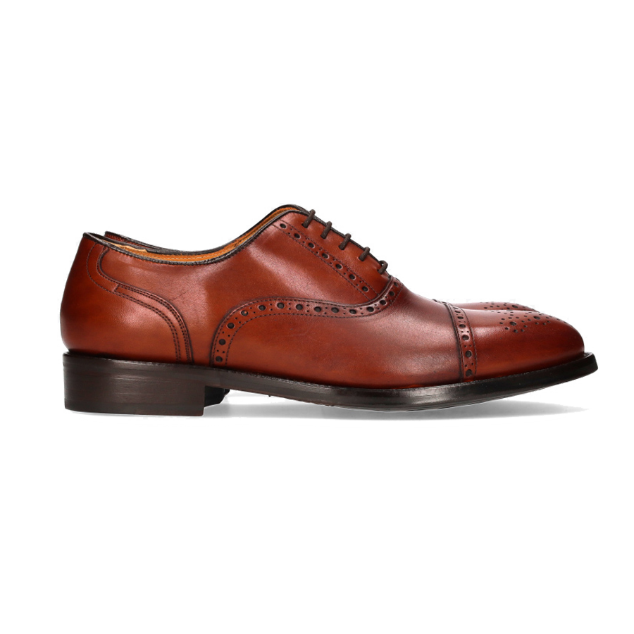 Zapatos de cordones de hombre, tipo inglés, en piel victoria de color cuero. Piso inyectado negro-cuero