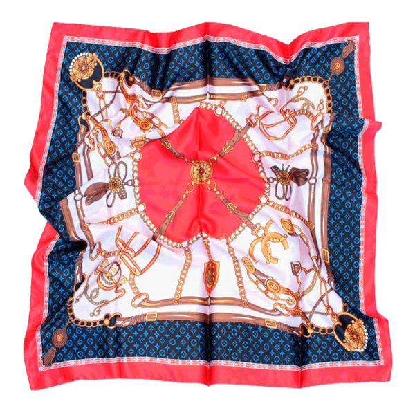 Pañuelo de poliester, color adornos en colores marino y rojo tamaño 90 x 90