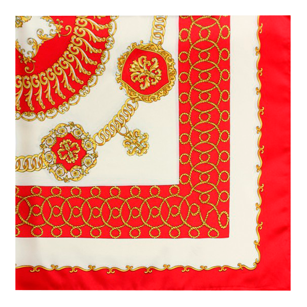 Pañuelo de poliester, color rojo con estampado de cadenas en oro, tamaño 90 x 90