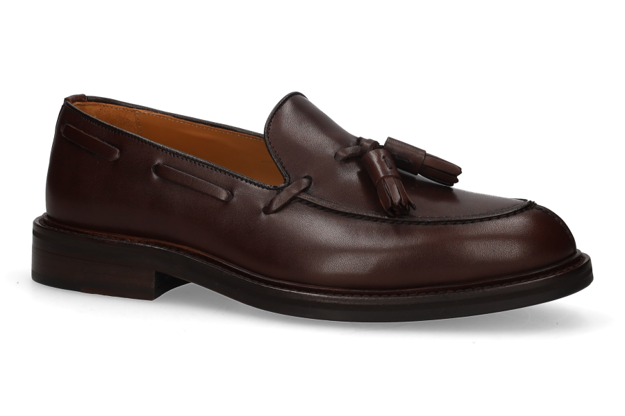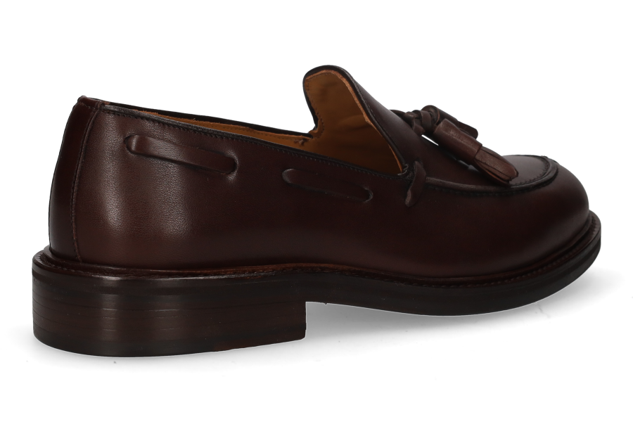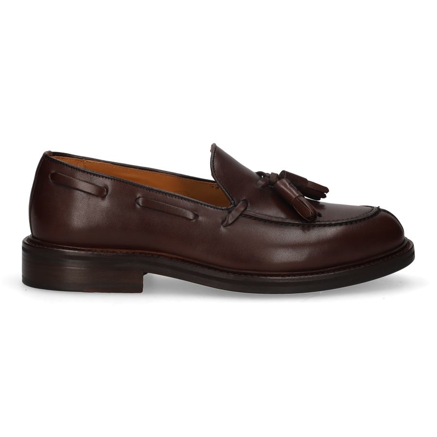 Mocasín de caballero, tipo presidente, con adorno de borlas. En piel boxcalf de color marrón y piso inyectado negro-cuero.